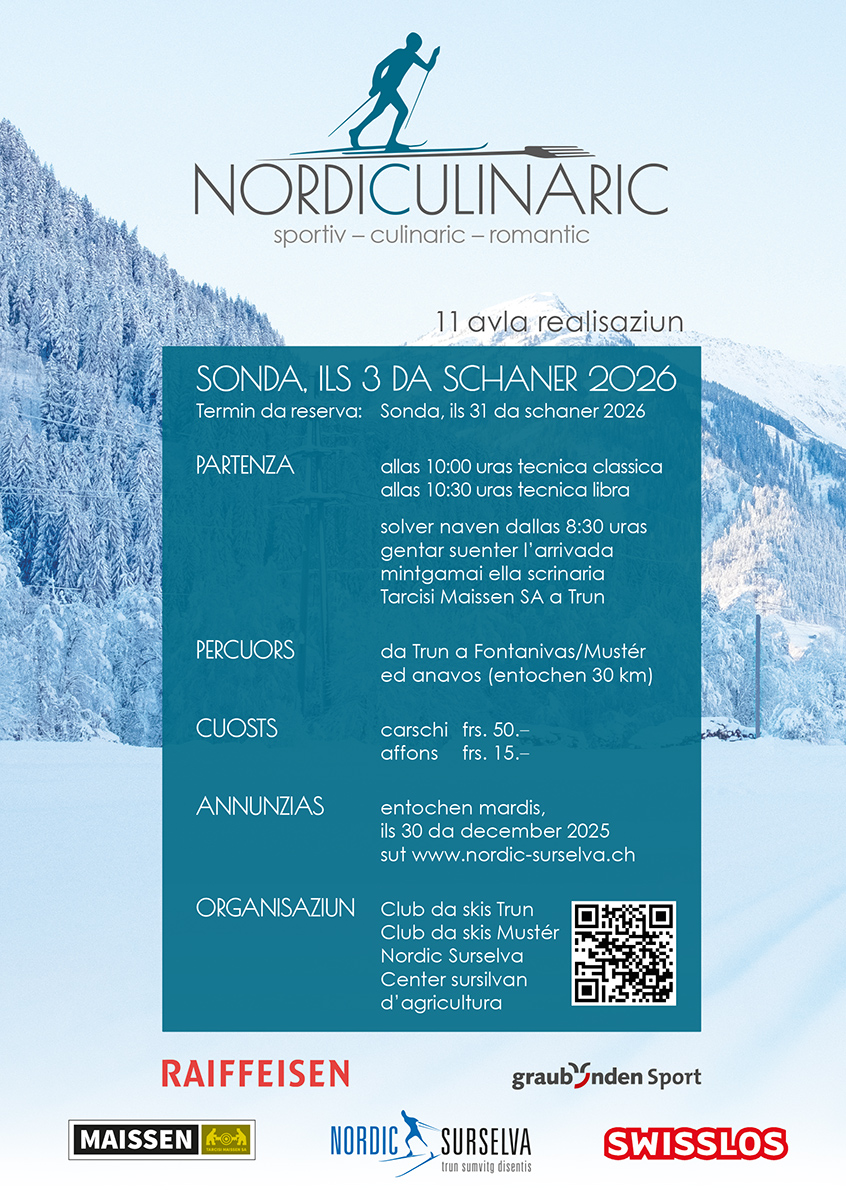 NordiCulinaric 2026La 11avla realisaziun dil NordiCulinaric ei ils 3 da schaner 2026.(Termin da reserva: 31. da schaner 2026) Cun salids sportivs |